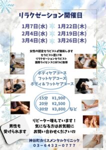 リラクゼーションの日のお知らせ 公開済み: 2025年12月10日更新: 2025年12月10日作成者: charis-mentalカテゴリー: 未分類 本日、当院ではリラクゼーションの日を開催しております。リピーターの皆様も増え、大変ご好評いただいております。 本日分の予約は埋まってしまっておりますが、次回が年内最後! 12月25日(木)クリスマスに開催させて頂きます。 1年間頑張った自分自身へのご褒美に、普段お世話になっている親しい方へのプレゼントに、ご予約お待ちしております。 予約はお電話で承っております。 1~3月分の日程も決まりましたのでご報告させて頂きます。引き続きよろしくお願いいたします。